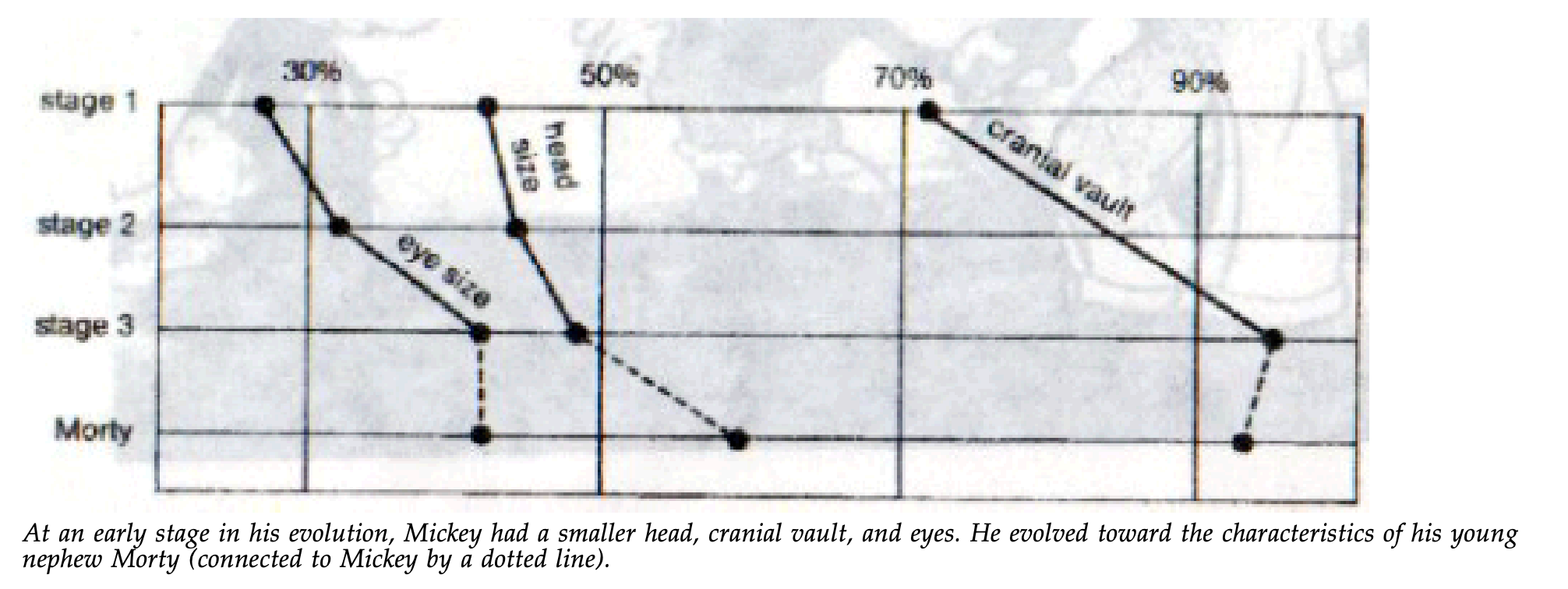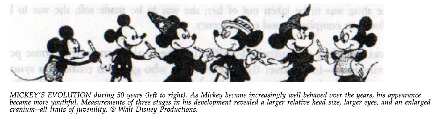 Figure 3. Mickey Mouse became more of a super stimulus over time hijacking our empathy for young children with his physical features. - from: https://faculty.uca.edu/benw/biol4415/papers/Mickey.pdf